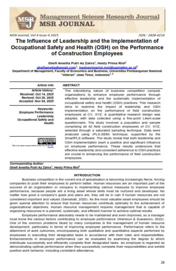 The intensifying nature of business competition compels organizations to enhance employee performance through effective leadership and the systematic implementation of occupational safety and health (OSH) practices. This research aims to examine the impact of leadership and OSH implementation on the performance of field construction employees at CV. XYZ. A quantitative research design was adopted, with data collected using a five-point Likert-scale questionnaire. The study involved a population and sample comprising all 42 field construction employees of CV. XYZ, selected through a saturated sampling technique. Data were analyzed using (PLS-SEM) technique, supported by the SmartPLS software. The study reveal that both leadership and OSH implementation exert a positive and significant influence on employee performance. These results underscore that effective leadership and consistent adherence to OSH practices are crucial in enhancing the performance of field construction employees.