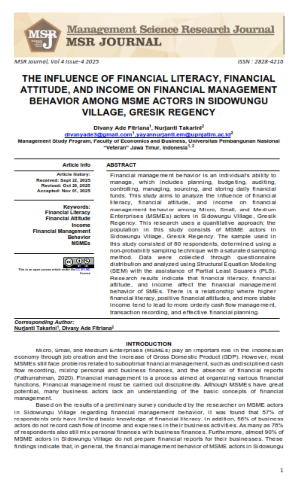 The THE INFLUENCE OF FINANCIAL LITERACY, FINANCIAL ATTITUDE, AND INCOME ON FINANCIAL MANAGEMENT BEHAVIOR AMONG MSME ACTORS IN SIDOWUNGU VILLAGE, GRESIK REGENCY
