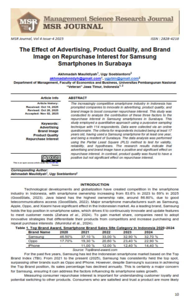 The increasingly competitive smartphone industry in Indonesia has prompted companies to innovate in advertising, product quality, and brand image to boost consumer repurchase interest. This study was conducted to analyze the contribution of these three factors to the repurchase interest in Samsung smartphones in Surabaya. This study employed a quantitative approach using a purposive sampling technique with 114 respondents. Data were collected via an online questionnaire. The criteria for respondents included being at least 17 years old, having used a Samsung smartphone for at least one year, and being a resident of Surabaya. The data analysis was performed using the Partial Least Square (PLS) method to test for validity, reliability, and hypotheses. The research results indicate that advertising and brand image have a positive and significant effect on repurchase interest. In contrast, product quality was found to have a positive but not significant effect on repurchase interest.