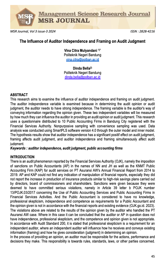 The Influence of Auditor Independence and Framing on Audit Judgment