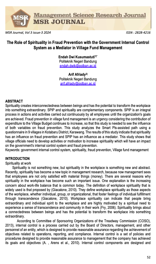 The Role of Spirituality in Fraud Prevention with the Government Internal Control System as a Mediator in Village Fund Management