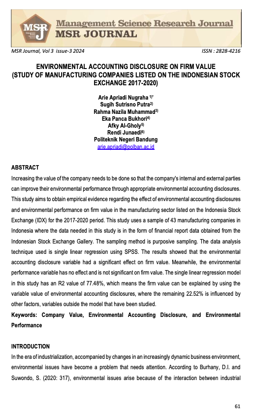 Environmental Accounting Disclosure on Firm Value (Study of Manufacturing Companies Listed on The Indonesian Stock Exchange 2017-2020)