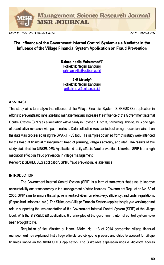 The Influence of the Government Internal Control System as a Mediator in the Influence of the Village Financial System Application on Fraud Prevention